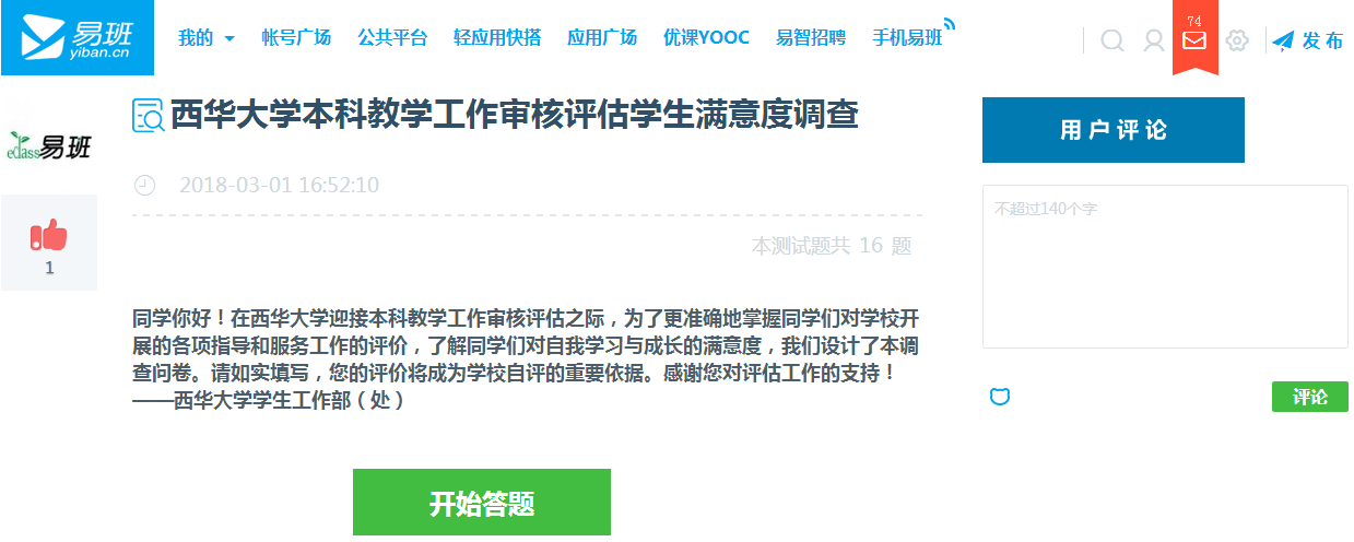 通过网页端口,点击访问链接http://www.yiban.cn/questionnaire/index/ques/quesid/44995,登陆个人易班账号,即可填写调查问卷,完成全部16个题。