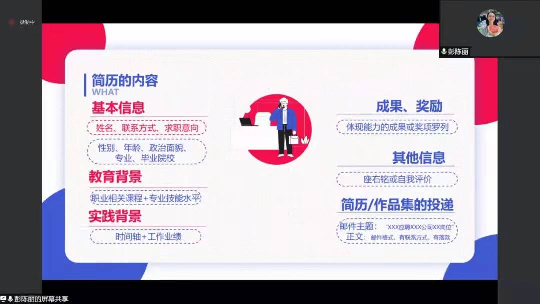 12月10日晚8点,由betway88西汉姆联团委指导老师彭陈丽老师主讲的简历制作培训会在腾讯会议线上开展。会议主要分为三个部分:简历撰写思路、简历制作基础内容和参赛简历点评。此外,彭老师还耐心回答了大家的提问,让更多的同学了解到怎样制作一份精美的简历,提高自己的职场竞争力。