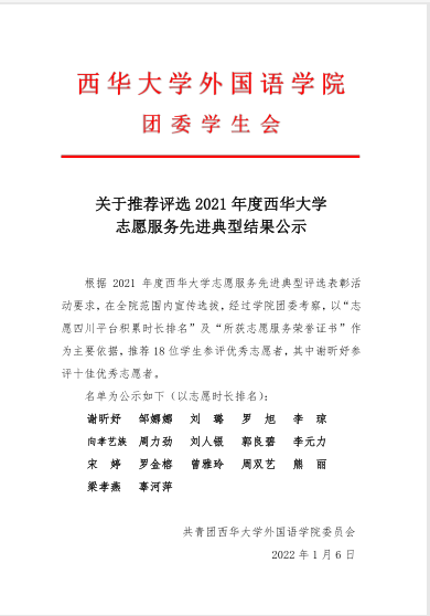 关于推进评选2021年度西华大学志愿服务先进典型结果公示