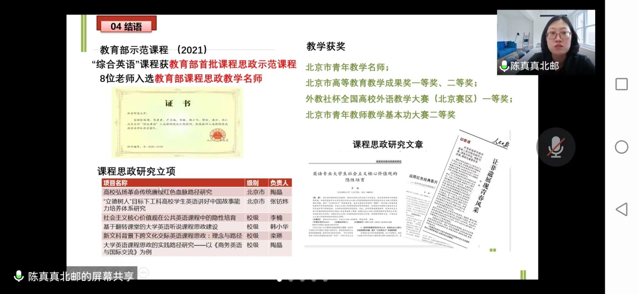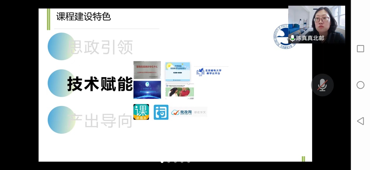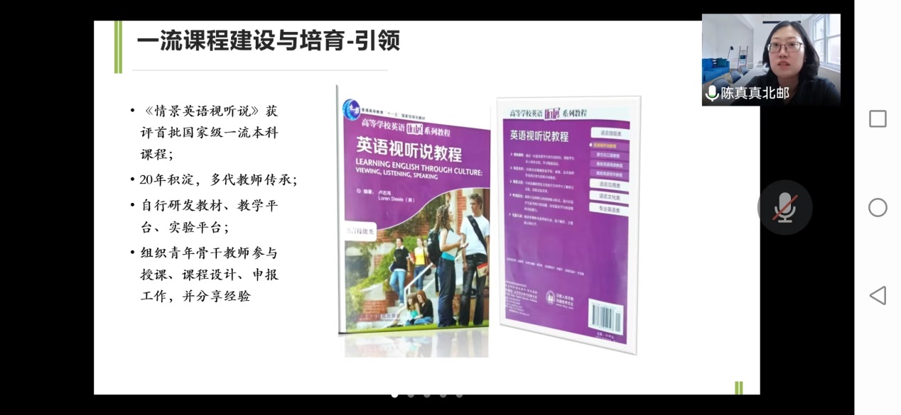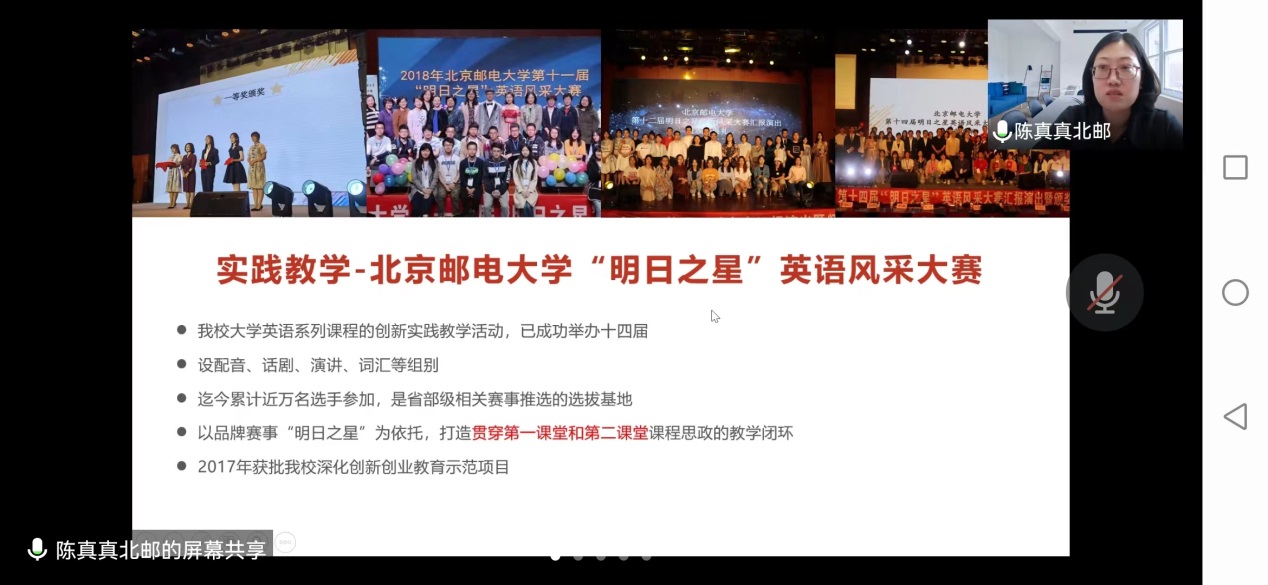 依托现代教育技术进行教学和改革,自主研发教材、教学平台和实验平台,在“全环节育人”理念下,促进了师资建设,课程内容的改革与建设,教学管理水平的提高和教学评价的多元化。北邮的《情景英语视听说》获首批国家一流本科课程,该课程经过20年积淀,多代教师传承,培养了一大批优秀教师,并通过“以赛代练,以赛促教”,参加各级各类教学比赛获奖;促进了科研和教学的发展,成功获批国家社科基金项目等各种高水平研究项目,发表高质量研究成果。组织“明日之星”校园风采大赛,将中国元素融合,鼓励学生讲好中国故事,促进学生全面发展。