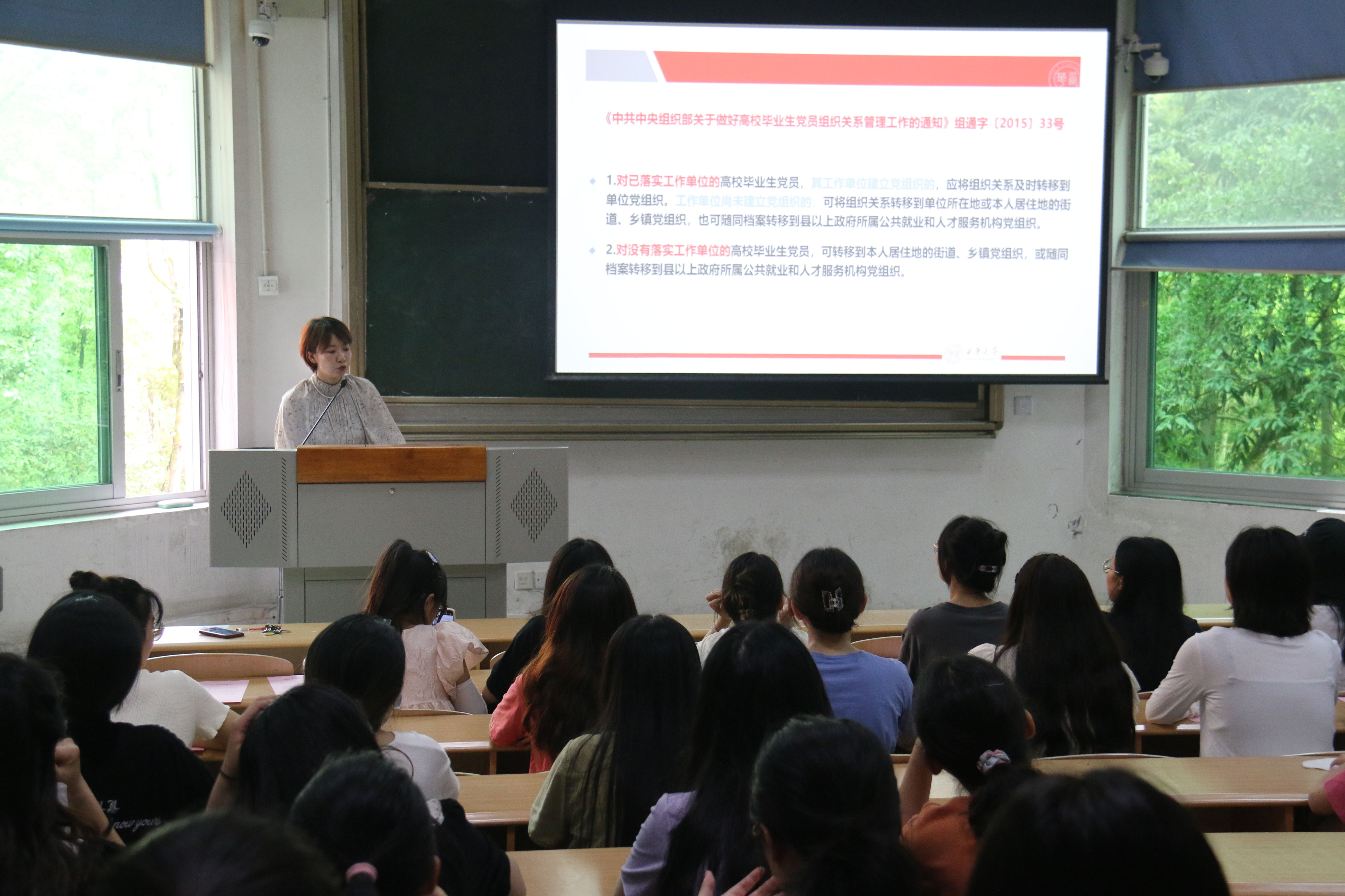 会议第一个议程是学院党委副书记罗海致辞罗海副书记强调了毕业生文明离校工作的重要性,同时罗海副书记对全体毕业生党员提出了要求,希望同学们要规范履行党员权利和义务,时刻铭记党员身份,充分发挥毕业生党员的榜样示范引领作用。会议第个议程是全体党员重温入党誓词2022届本科毕业生党员彭洁领誓铿锵有力的誓言,激励着全体毕业生党员不忘初心、牢记使命。会议第个议程是全体毕业生党员签署《西华大学毕业生党员承诺书》会议第个议程曾渝理老师给毕业生党员讲解党组织关系转接注意事项。曾老师强调了党组织关系转接注意事项,对毕业生党组织关系转接进行了专题培训,并进行了详细的解答。