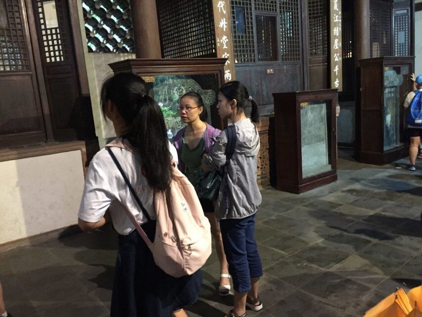 7月7日,外国语学院2018暑期“三下乡”杜甫草堂小分队在进行了两天的解说学习后,于今日正式开展了定点解说的活动。到达草堂后,队列成员各自熟悉解说词,采用分组进行的方式,为来到草堂的游客进行解说。其中,队列7人分为三组,分别在大廨、工部祠和茅屋三个景点开展讲解工作。
