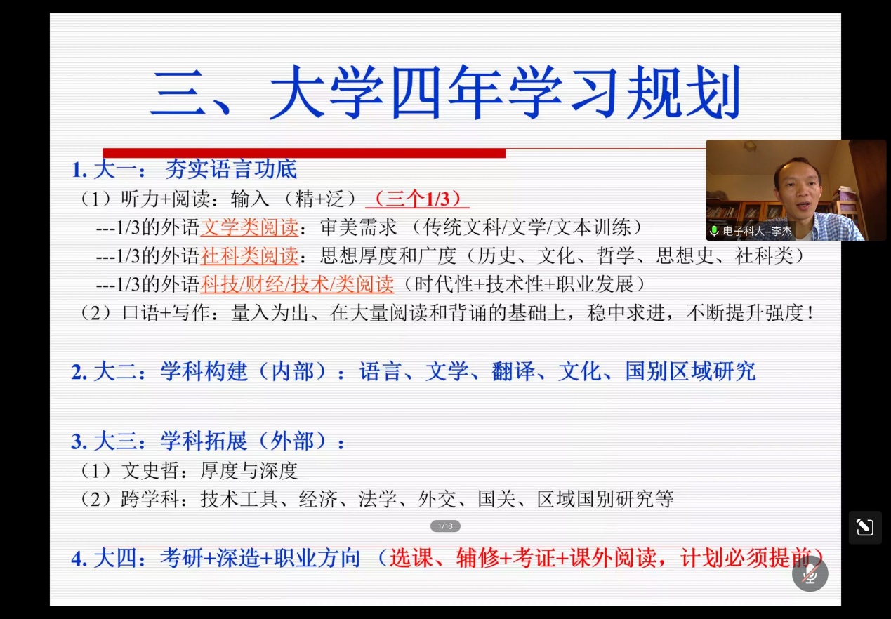 首先,李老师概括出此次会议的主要内容,并提出三个关键问题“为什么学外语?”“外语专业的核心竞争优势”以及“大学四年的学习规划”,他从不同角度出发,层层递进,引起同学们的思考。
