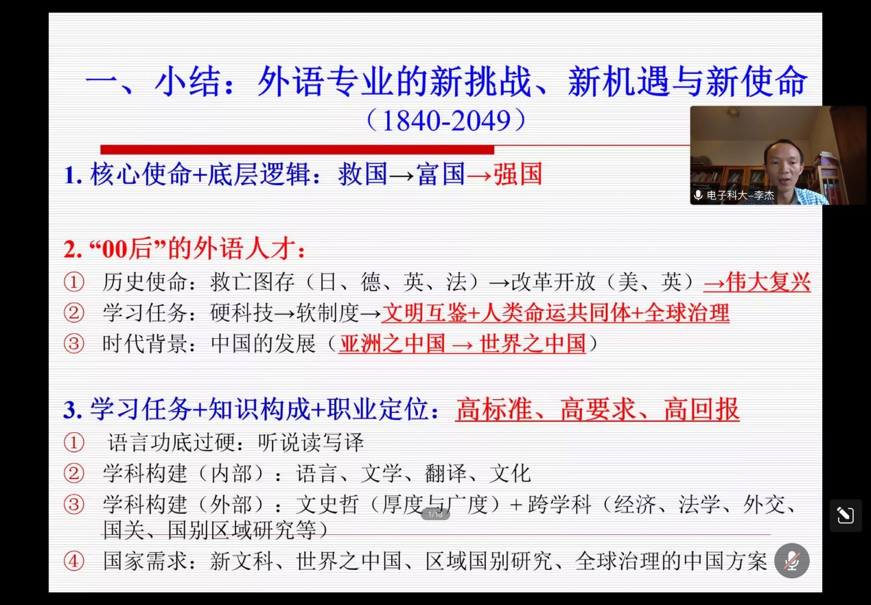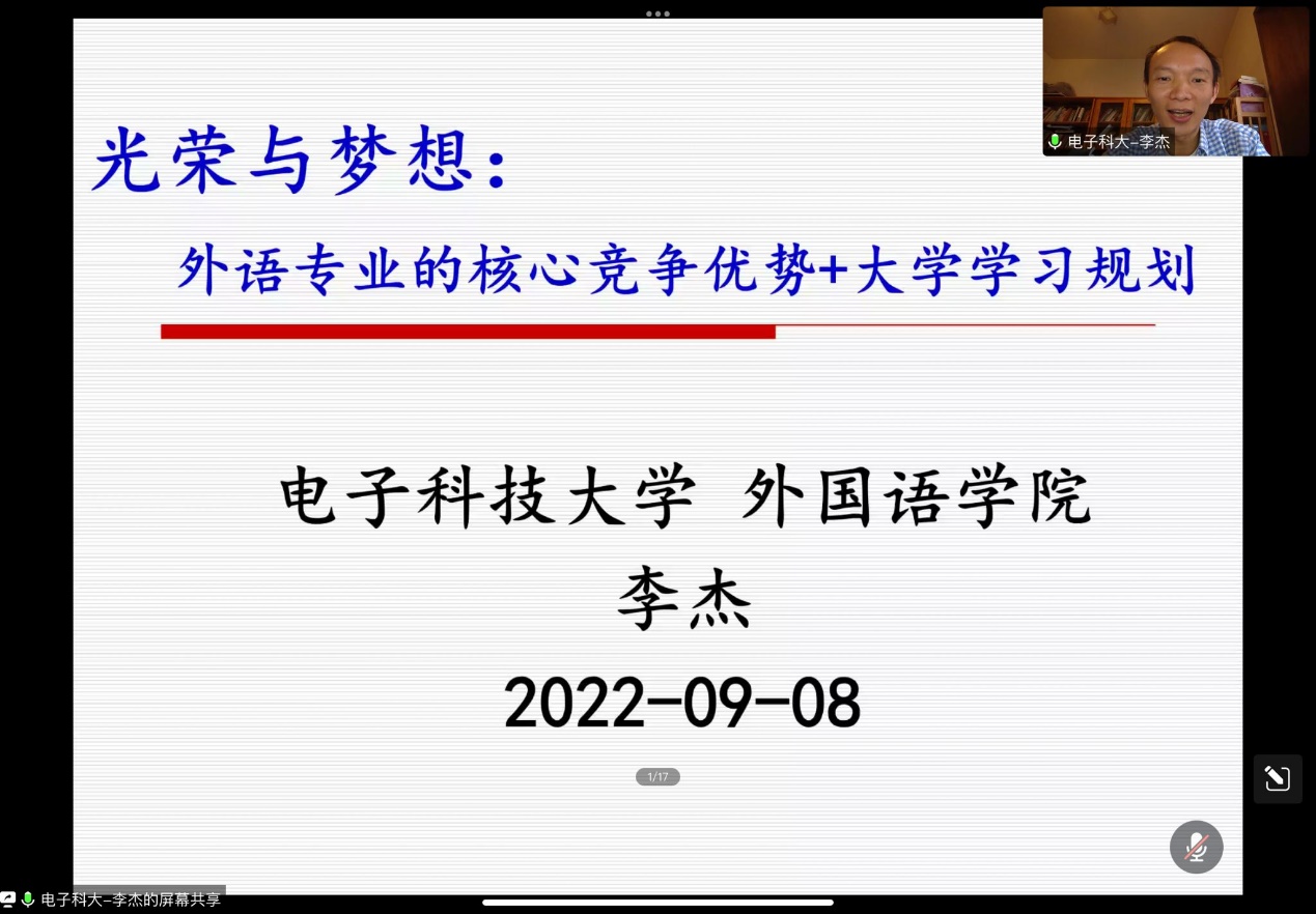 为提高同学们对外语专业核心竞争优势的认识和建立更清晰的大学学习规划,2022年9月8日,betway88西汉姆联邀请电子科技大学betway88西汉姆联副教授李杰在腾讯会议开展了以“光荣与梦想——外语专业的核心竞争优势及大学学习规划”为主题的西华讲堂。betway88西汉姆联副院长李学芹主持本次讲座,辅导员罗雨虹以及全体大一新生参与本次云端讲座。