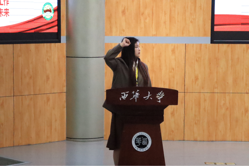 在大会的最后,罗雨虹老师教导同学们一定要感党恩、听党话、跟党走,同时也要具有勇立潮头的进取精神、坚如磐石的理想信念、炽热如火的家国情怀。并由第二十届团委副书记李字颖带领第二十届团委学生会全体成员进行宣誓。