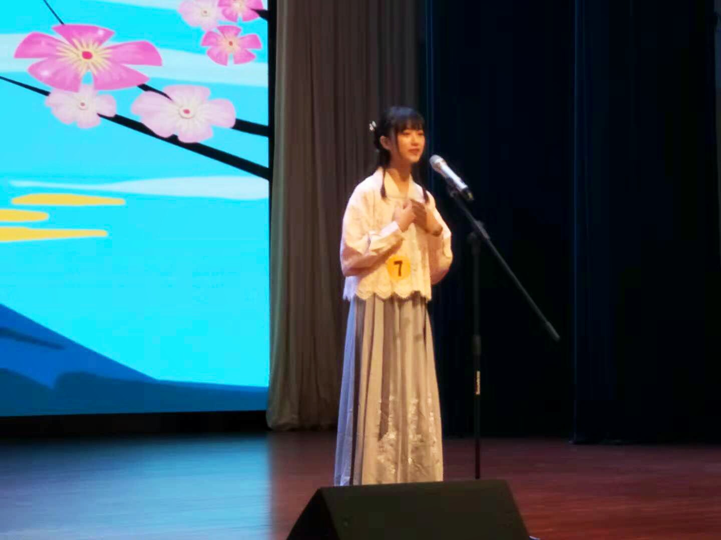 我院学子罗若菲在此次比赛中以“向世界介绍中国文化”为主题,向在场嘉宾们介绍了我国的汉服文化,经过两轮激烈角逐,表现出色,取得本次大赛三等奖的好成绩。