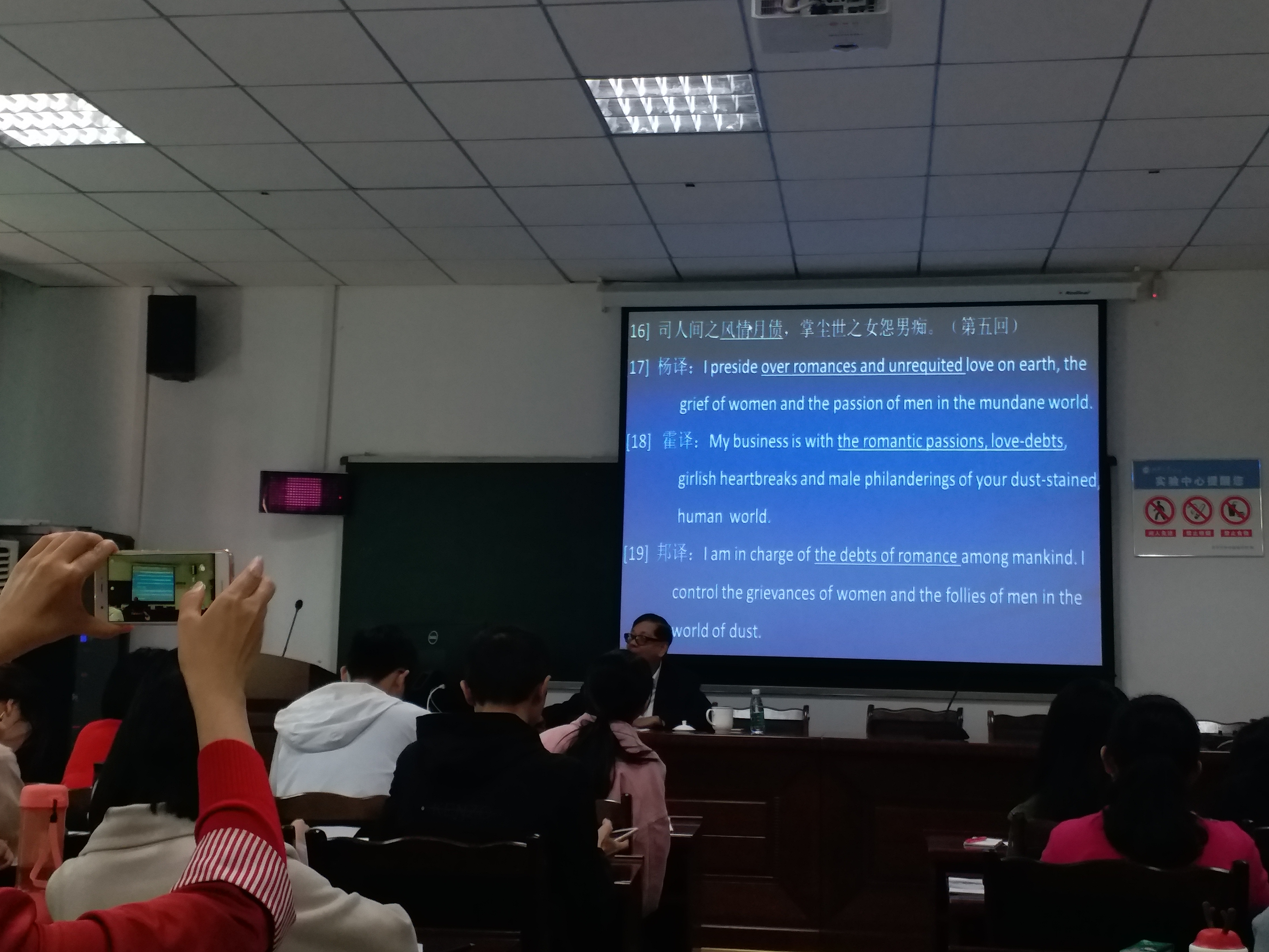 王寅教授幽默又不失严谨的向大家介绍了体认语言学,接着从体认语言学的视角以《红楼梦》中所涉及到的成语的不同中英译本为例,以具体的翻译实例进行了系统的讲解。王寅教授提及到成语翻译的三层次观:译者可分别在“现实、认知、语言”三层面上择一或二进行翻译。王寅教授认为,当译者读到某一成语之后,将透过字面意义和上下文情景获取与之相对应的认知意义(原型意义、内涵意义、概念意义),便可据此还原出其所描写的现实场境,这一理解过程依旧涉及到“现实、认知、语言”三要素。译者在翻译时可选择其中任一(或二)要素作为翻译的主要依据,要么在语言层面翻译其字面表达,要么在认知层面翻译其原型意义,要么翻译其指代的经验事实;译者还可将认知层面分别与语言层面或现实层面相结合。同时,王寅教授根据语言层面、认知层面和现实层面的特点提出了对应的翻译策略。
