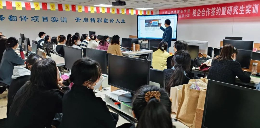 签约仪式结束后,思译翻译公司实训项目部为学院在校研究生进行了翻译实训,为参训学生带来了职业、行业、翻译技能技巧等主题内容讲授和交流,整体气氛活跃,学生们争相发言,有问有答。