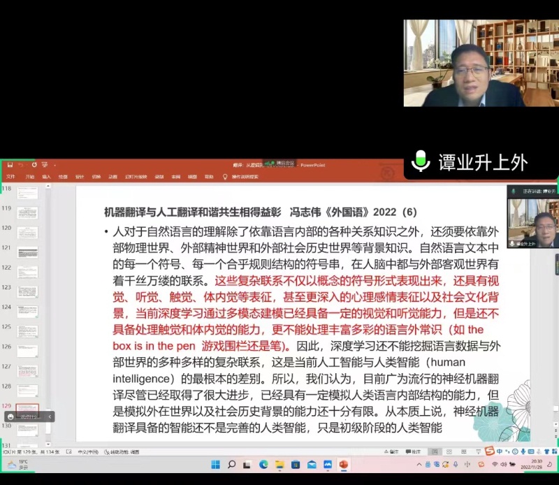 2022年11月28日,上海外国语大学谭业升教授应邀为西华大学betway88西汉姆联师生作题为《翻译:从逻辑到具身认知》的讲座。