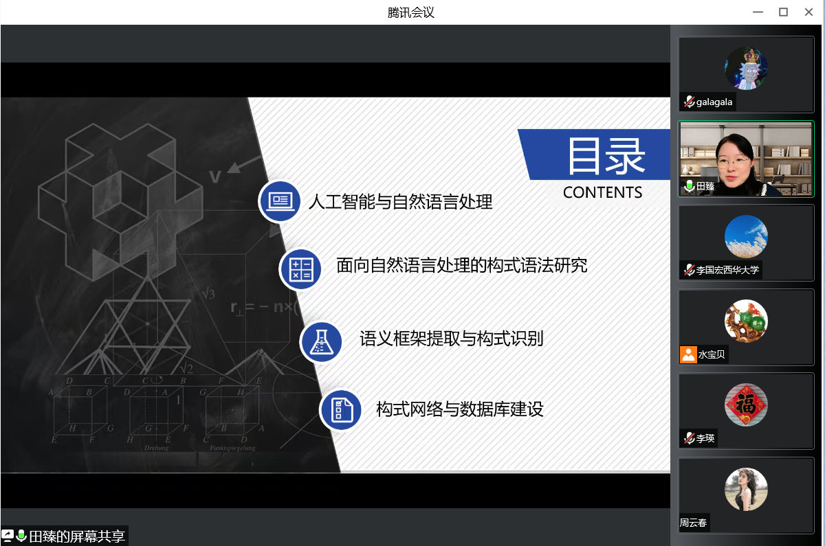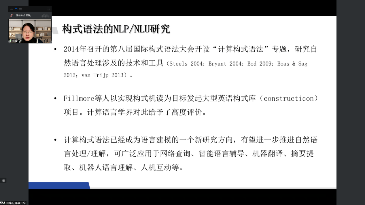 田教授从“人工智能与自然语言处理、面向自然语言处理的构式语法研究、语义框架提取与构式识别、构式网络与数据库建设”四个部分展开了本次讲座。