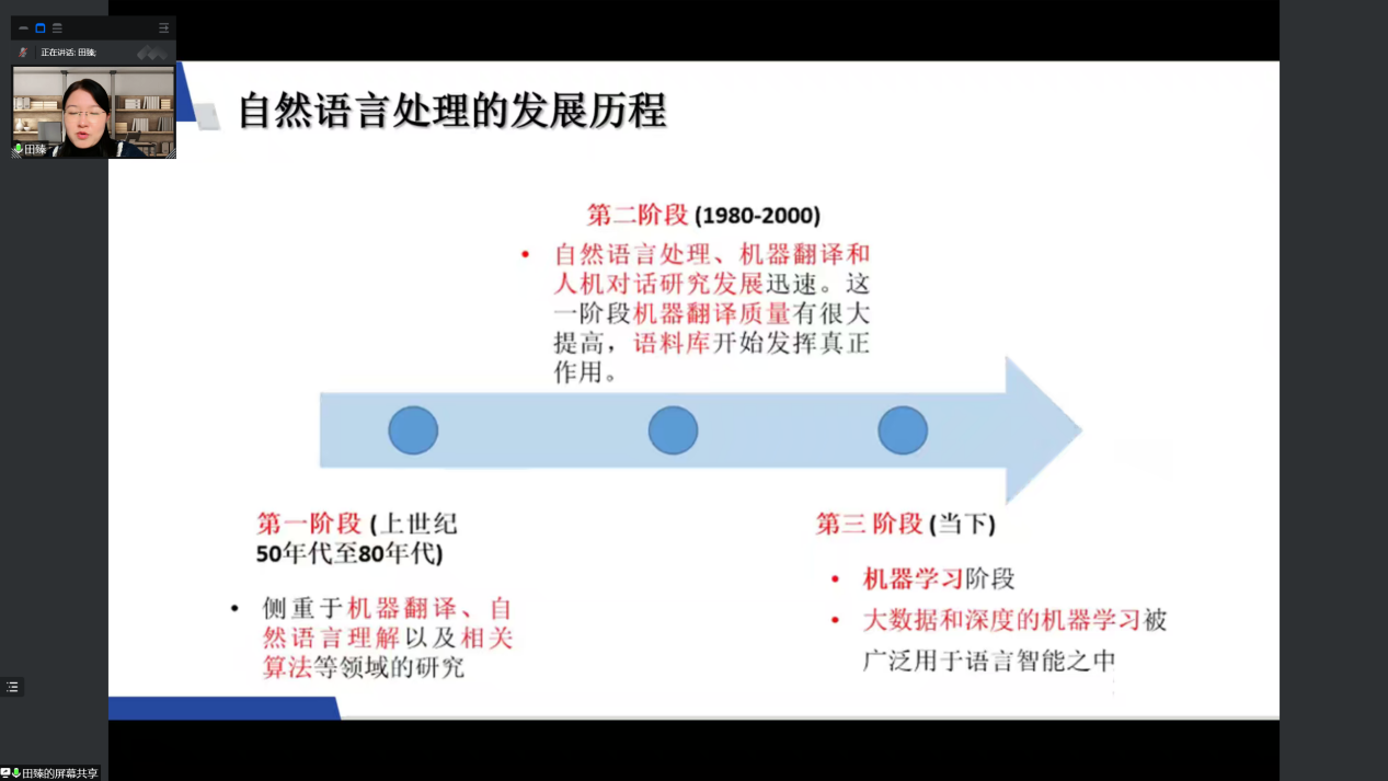 第一部分田教授首先介绍了“人工智能的争议、人工智能的应用”,以及“自然语言的发展历程、自然语言处理的关键问题、基于规则的自然语言处理方法(理性方法)和基于统计学习的自然语言处理方法(经验方法)”等背景知识,为后续的分析介绍做足了铺垫,同时引发了听者对人工智能大数据应用于语言习得研究的强烈兴趣。