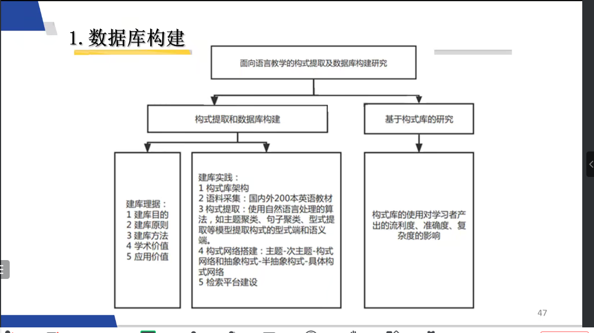 在第四部分,田教授介绍了基于中小学英语教育,建立的面向语言教学的数据库,并进了生动的展示,让大家学习了基于主题的构式网络,以及不同抽象层级的构式网络的实例。田教授表示,目前已经开展了数据集使用的研究,通过开发小型数据集,上传网站,分析网站使用情况,进而研究同学们使用数据集学习的结果。