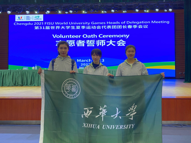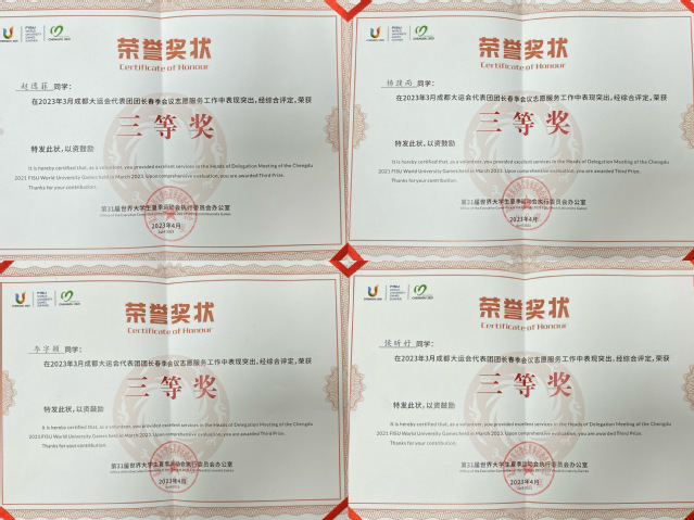 3月28日至3月31日,成都大运会代表团团长春季会议在蓉举行。成都大运会春团会招募了西华大学、四川大学、电子科技大学等10余所高校的206名志愿者参与志愿服务。我院2020级英语专业学生李字颖、2020级翻译专业学生杨濮而、侯昕妤、2021级翻译硕士赵逸菲担任本次春团会翻译志愿者,表现优异,获大运会执委会表彰。