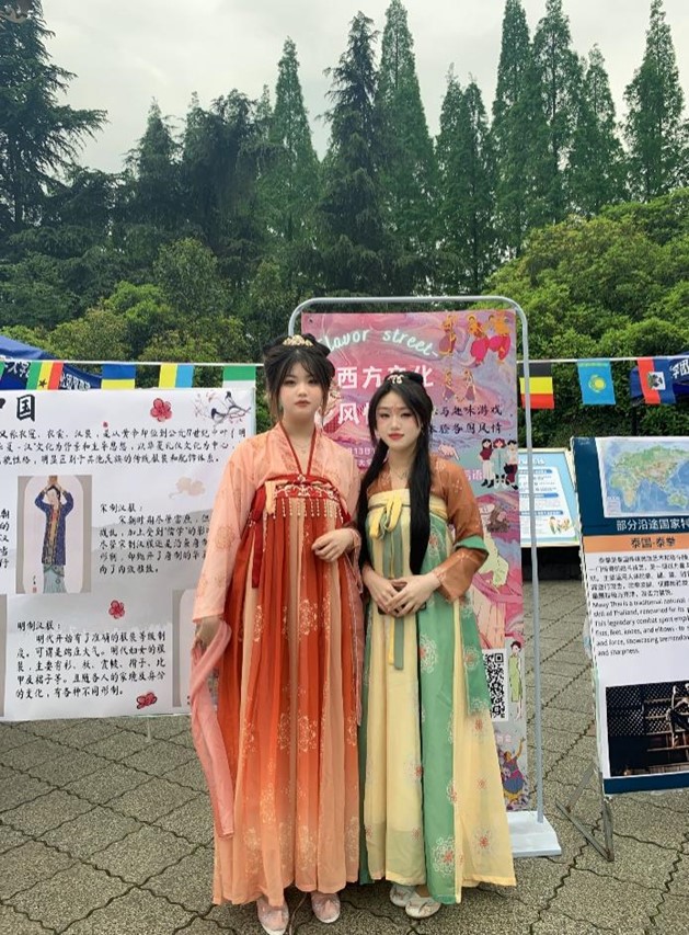 在中国展区中,制作了有关中国汉服的演变的文化展板并安排同学穿汉服,增添活动吸引力的同时也让同学们更加了解中国的传统服饰的发展演变,让同学们对汉服产生了浓厚的兴趣,增强了同学们的文化自信。