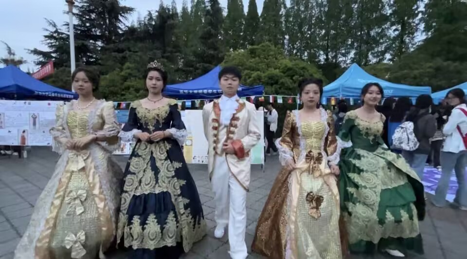 在英美展区,展示了在英国和美国具有代表性的建筑,安排志愿者同学展示中世纪欧洲宫廷服装,增加活动文化性和美观性,让同学们了解更多关于英国美国的知识,塑造良好的文化氛围,激发同学们的学习兴趣,开阔同学们的国际视野。