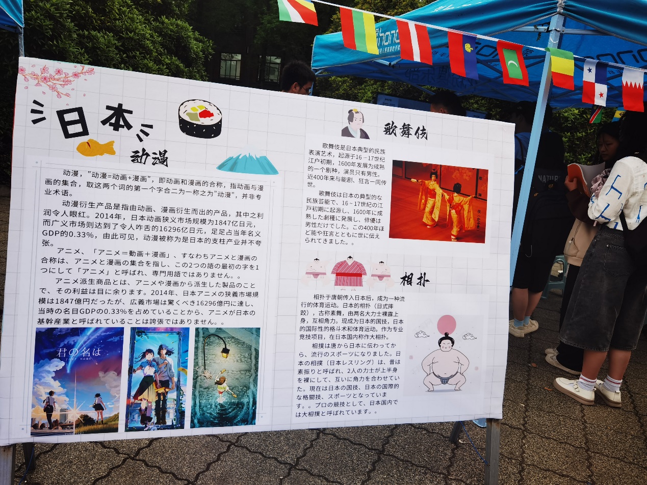 在日本展区,我们选择了展示日本的动漫、歌舞伎和相扑相关内容,让同学们对日本文化有了更多了解,营造了良好的文化氛围,并且让同学们在体验游戏乐趣的同时了解日本文化,激发同学们学习日本文化的兴趣,汲取外国文化精华,丰富自己,努力构建一个多元文化并存的社会。
