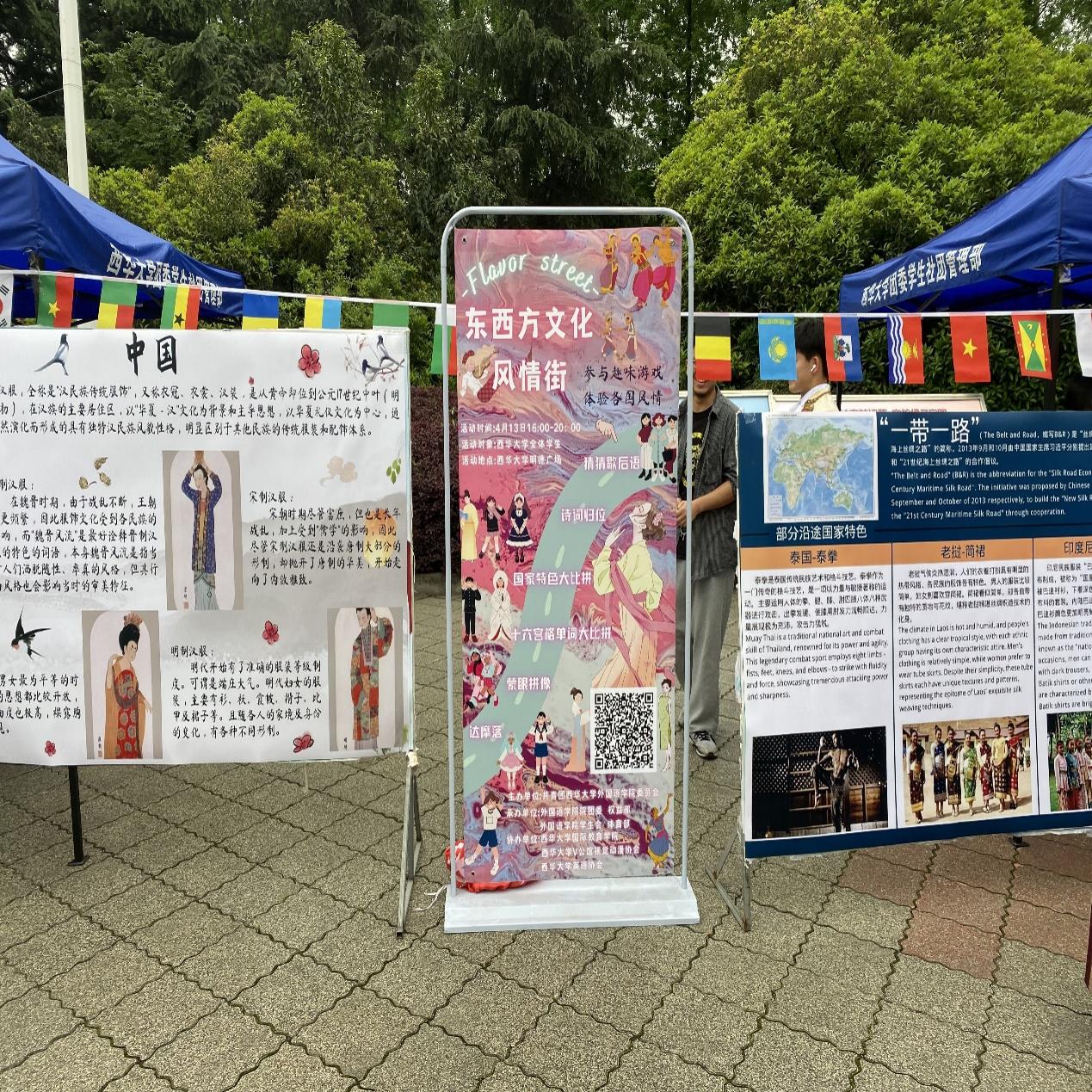 此次东西方文化风情街活动,本着参与趣味游戏、体验各国风情、展示国家文化多样性的目的,使同学们在体验异域风情、他国文化的同时激发同学们学习外语的兴趣。此次活动针对西华大学全体在校学生,共分成了四个板块:中国板块、一带一路板块、英美板块、以及日本板块,并在明德广场设四个点位,每个点位放着介绍国家特色文化的展板,并设置了相关小游戏。同时也邀请到了来自老挝、摩洛哥等国家的国际留学生,他们身着家乡特色服装,积极参与本次活动。