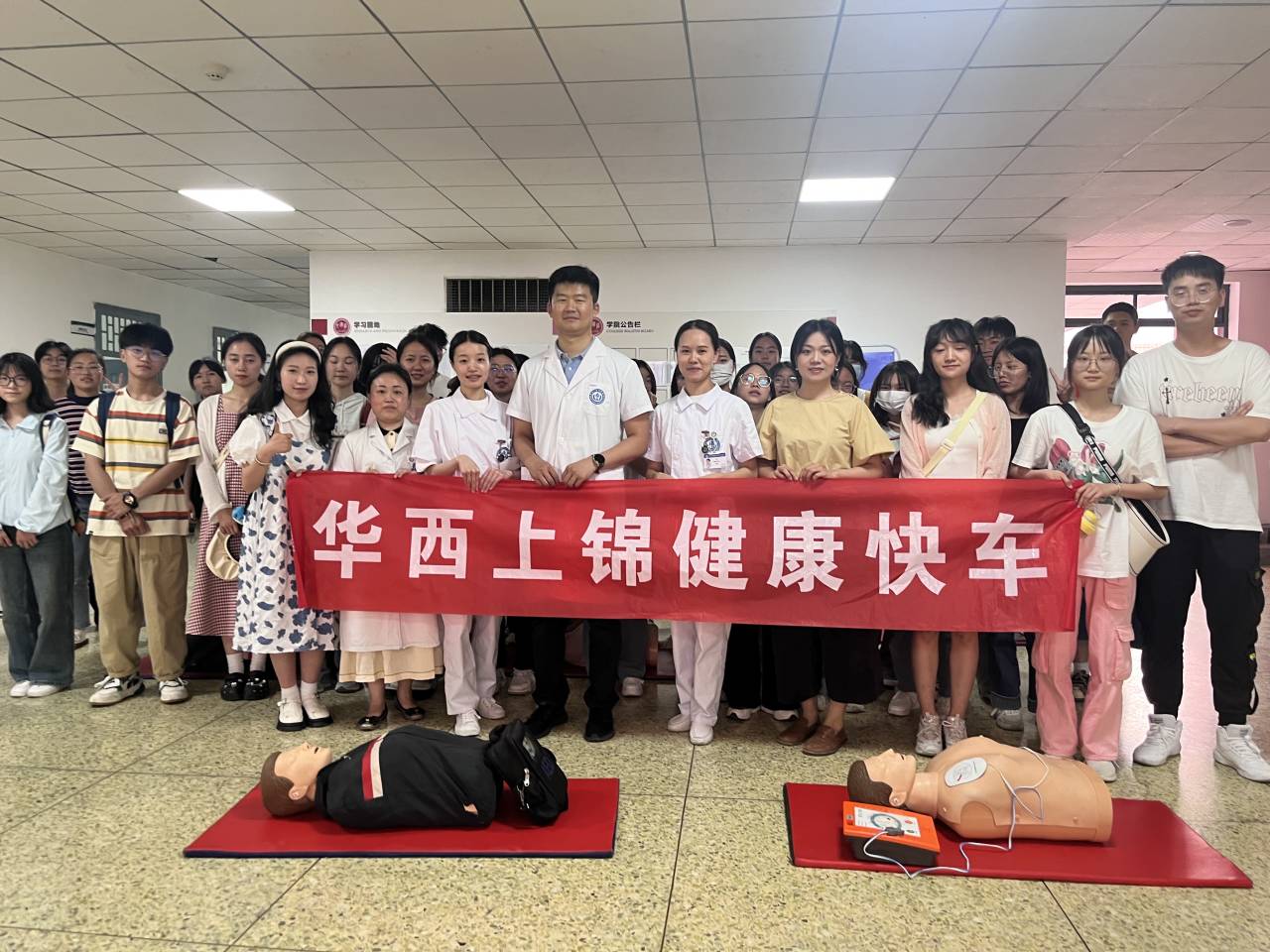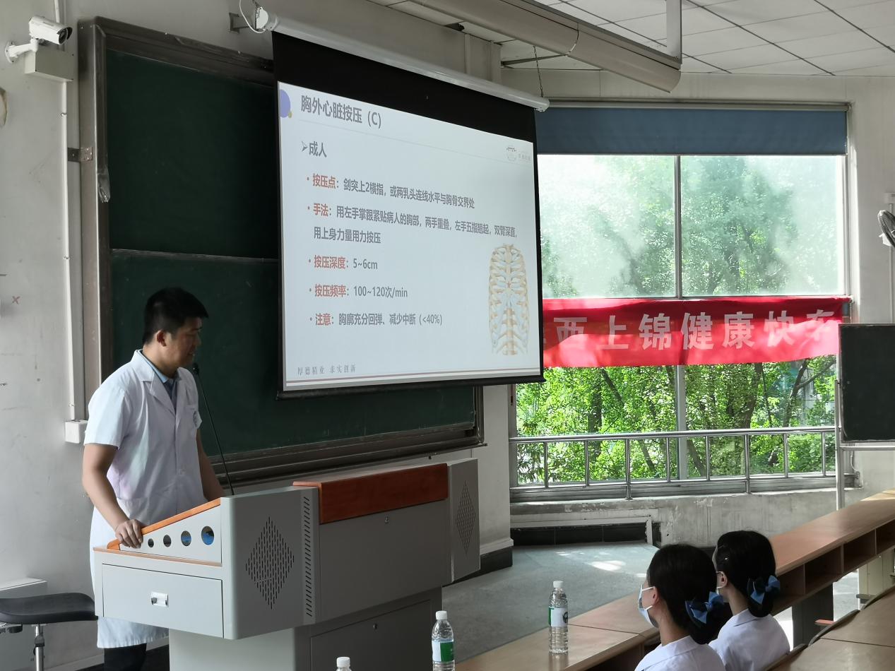 活动现场,华西上锦健康快车的郝学超教授,仔细地为同学们讲授了需要进行急救的突发状况,以及心肺复苏、海姆立克急救法等急救知识。随后,郝学超教授以及他的团队向同学们展示了胸外按压、人工呼吸等心肺复苏技术手法,告知大家遇到突发事件如何第一时间作出反应,如何抓住宝贵的急救"黄金4分钟",并提醒大家要根据被救者的实际情况进行施救,避免造成二次伤害。