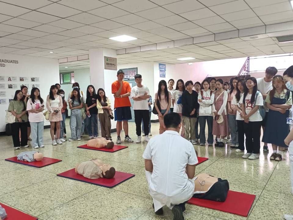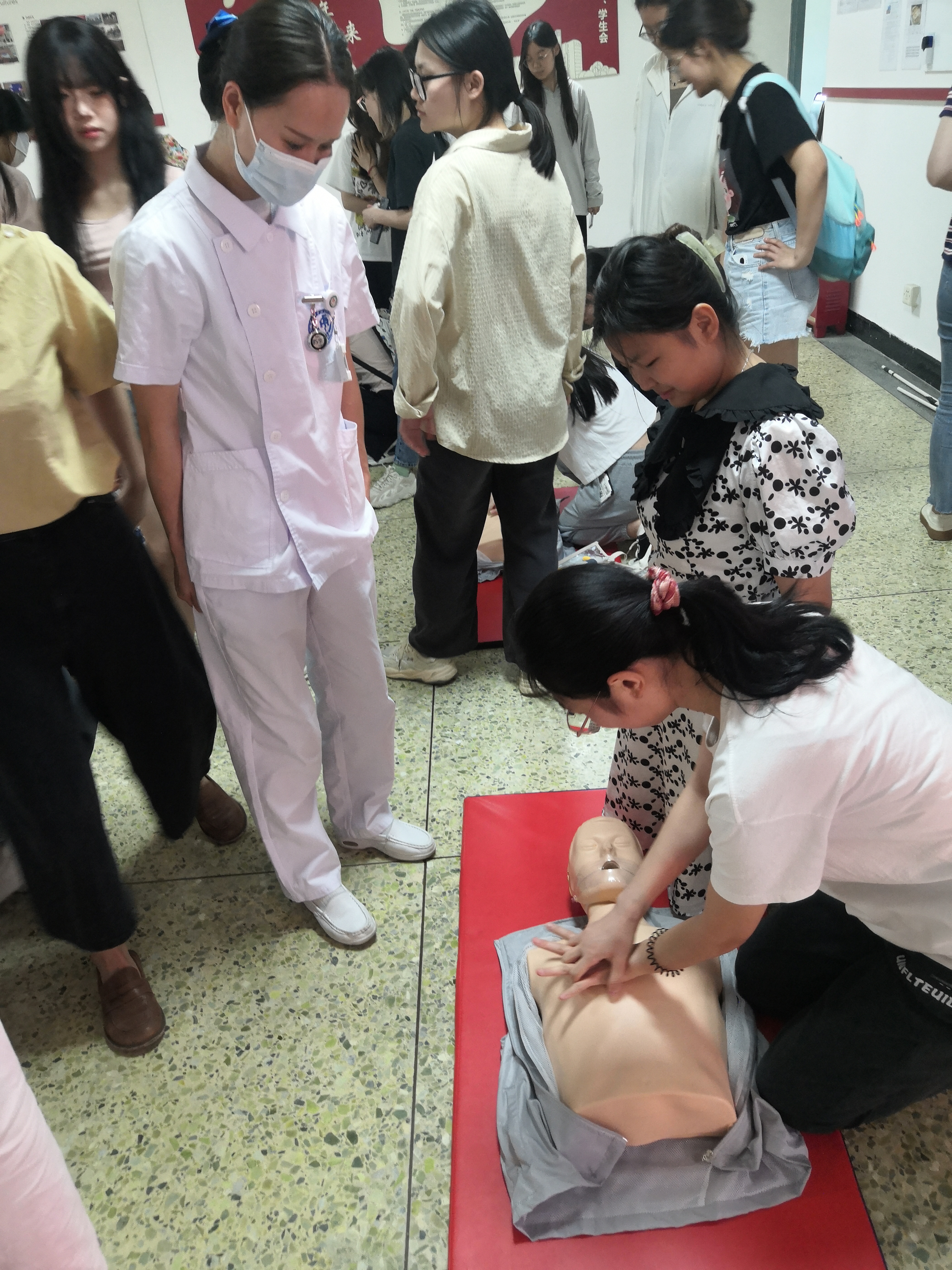 演示过后,同学们现场进行心肺复苏应急救护操作,郝教授及其团队在旁指导,一一解答同学们的问题,有不规范动作均一一耐心纠正。