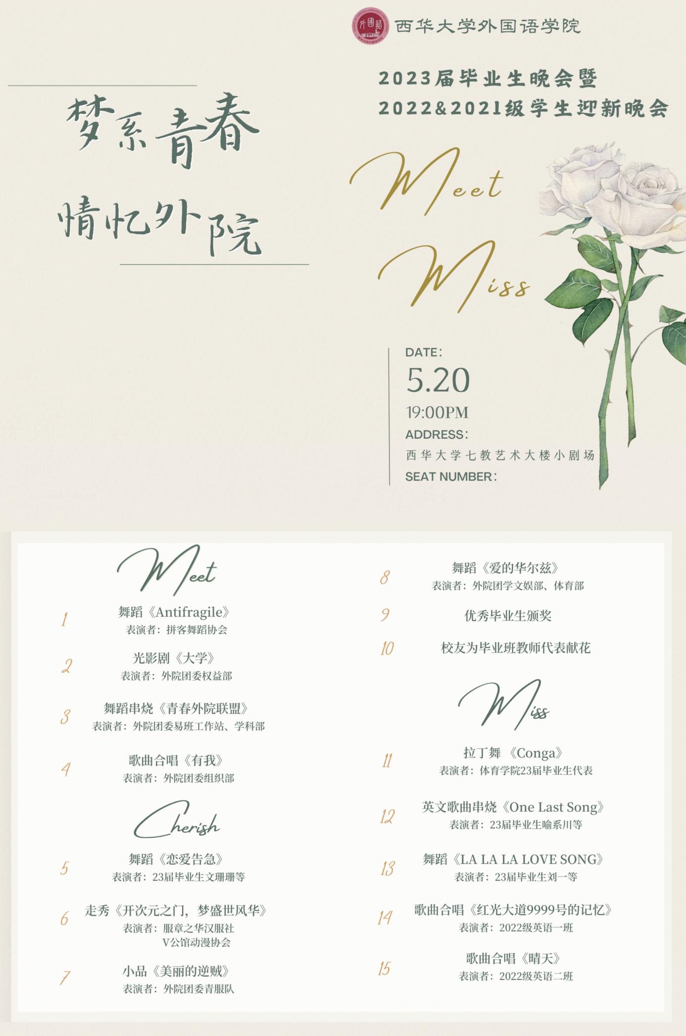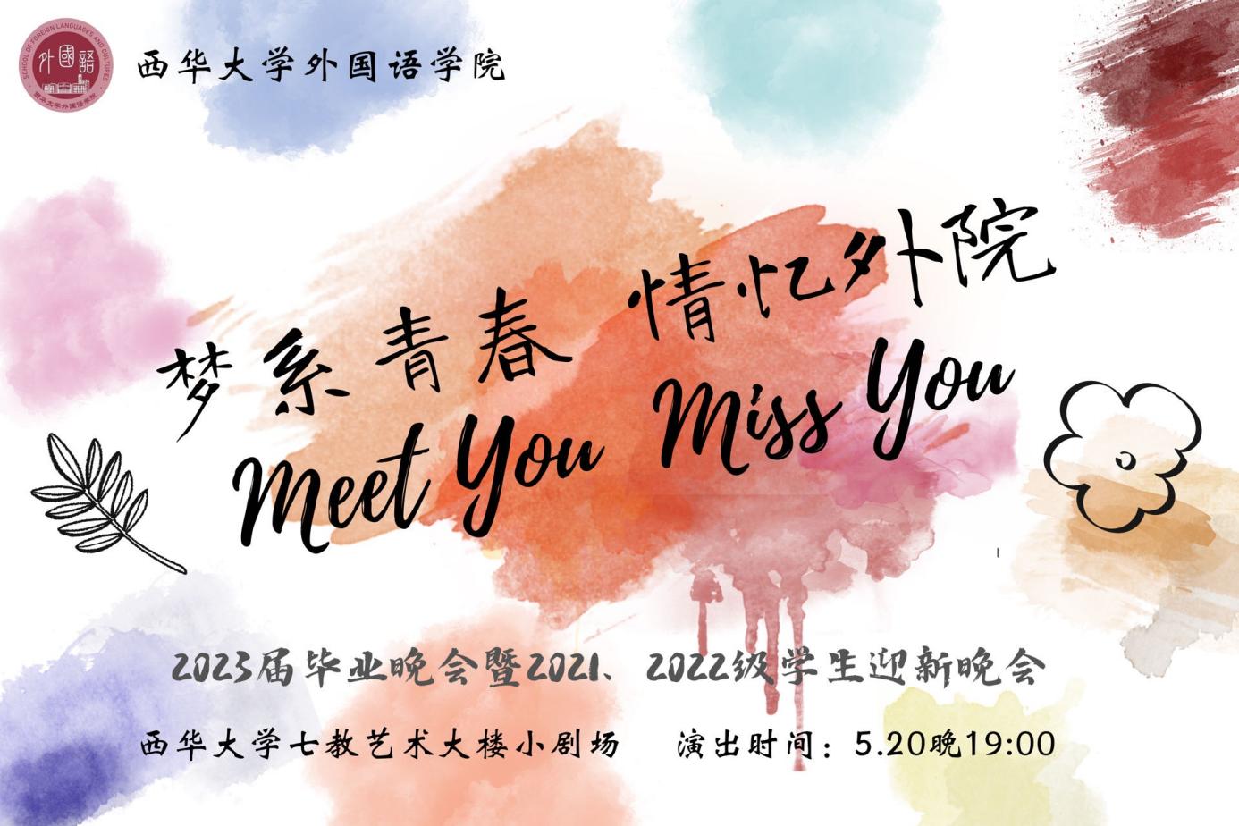 202352019:00西华大学betway88西汉姆联2023届毕业晚会暨2021&2022级迎新晚会在七教艺术大楼小剧场隆重举行。此次晚会以“梦系青春,情忆外院,Meet youMiss you为主题,betway88西汉姆联党委书记唐润华、院长李国宏、党委副书记罗海,各级辅导员、部分教师代表以及betway88西汉姆联第一届毕业生——2006届英语专业校友们出席了本次晚会。