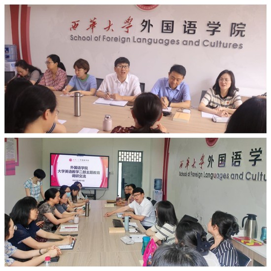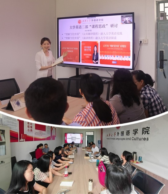 李学芹副院长首先对本次主题教育的内容和重要性进行了说明。将主题教育与大学英语教学结合起来,能更好地服务教学工作,不断深化教学改革。会上,李学芹副院长广泛听取了一线教师对大学英语课程教学的建议,系主任梁勇结合系部参加本年度2023年“教学之星”教学大赛,对《理解当代中国》系列图书与大学英语教学的有机融合进行了论述,二部副系主任彭旭对大学英语课程思政的具体内涵和新时代的要求进行了阐发。大家一致认为,大学英语课程涉及面广,《理解当代中国》系列图书融入大学英语课程大有可为,不同学科的学生具有十分大的潜力,大学英语教学应因材施教,在语言、知识、育人等多个维度不断提升教学效果和人才培养之类,全面落实立德树人根本任务,引导广大师生“不忘初心、牢记使命”,做社会主义核心价值观的坚定信仰者、积极传播者、模范践行者。