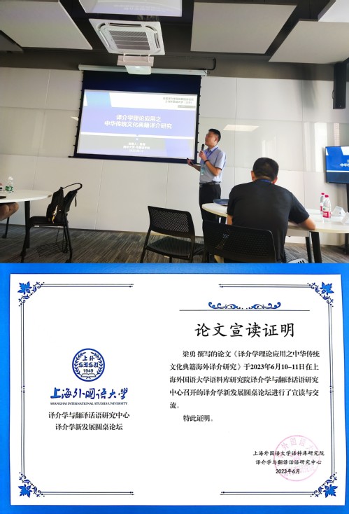 6月10日-11日,我院教师梁勇博士赴上海外国语大学参加“译介学新发展圆桌论坛”,并作报告。本次学术研讨会由上海外国语大学语料库研究院译介学与翻译话语研究中心主办,在上外松江校区召开,共有来自新加坡南洋理工大学、中国社会科学院、北京外国语大学、上海外国语大学、四川外国语大学等国内外高校的40余位学者参会。